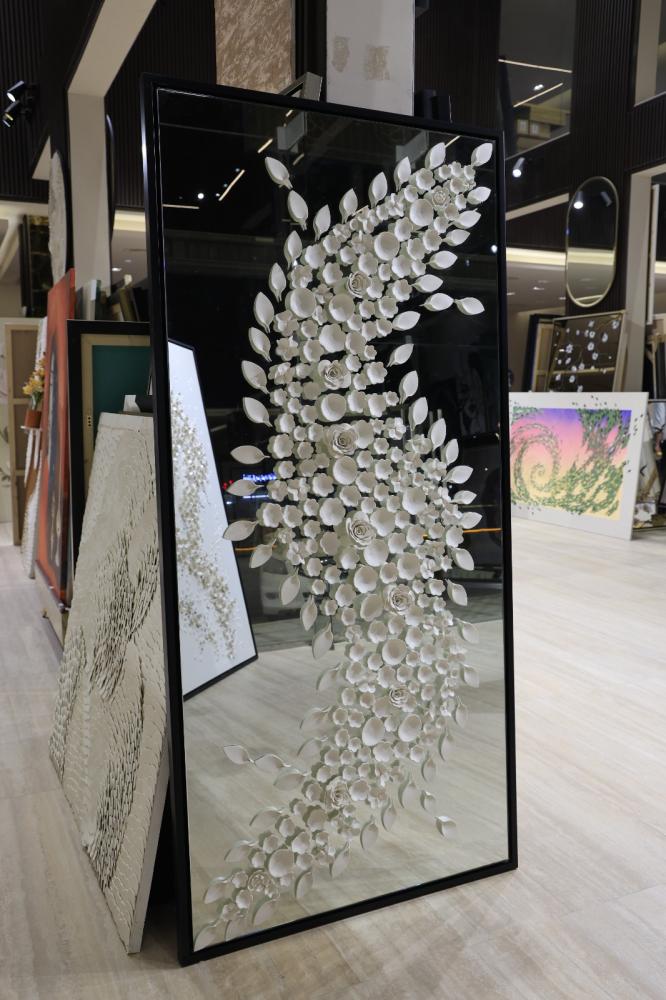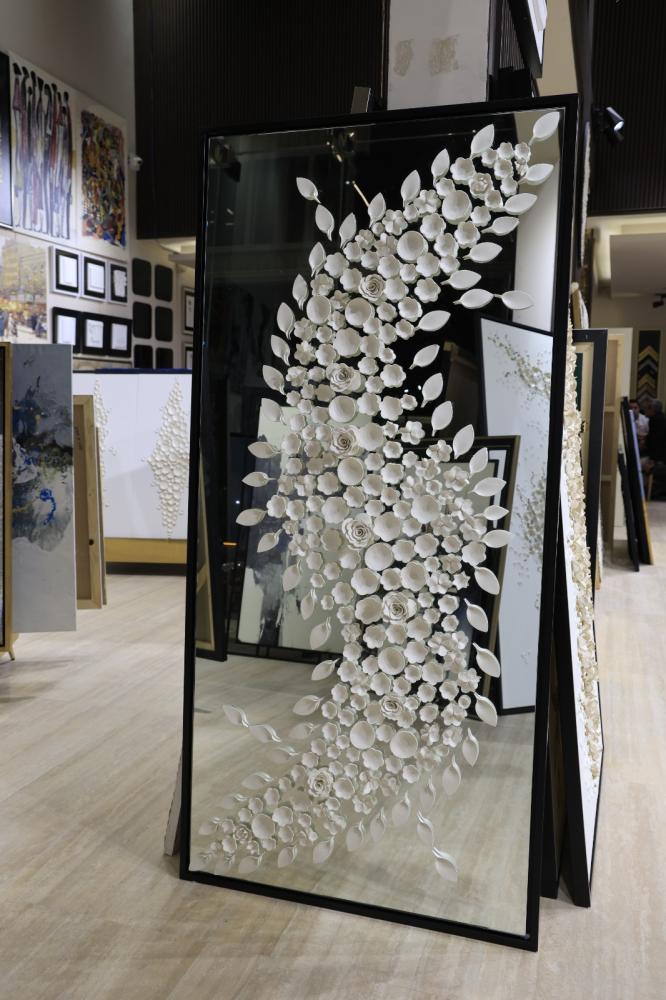 هذه المرآة تتميز بتصميمها الفني الأنيق، حيث تتوسط إطارًا يبرز النقوش البيضاء (الجبس)المتشابكة التي تشبه الزخارف النباتية أو الهندسية. الإبداع في التفاصيل يجعلها أكثر من مجرد مرآة، بل قطعة فنية تلفت الانتباه